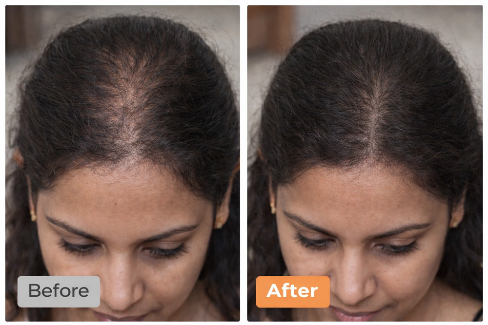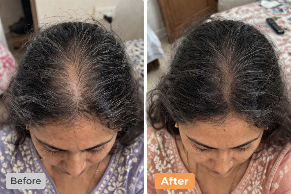 Always felt that there aren’t many effective and convenient options for women when it comes to hair thinning. Most products are either messy, time-consuming, or not designed keeping women’s routines in mind. This is simple, hands-free, and fits easily into my day. I’ve been using it consistently, and I can see a improvement in my hair density, especially around the parting...feels like a step in the right direction.